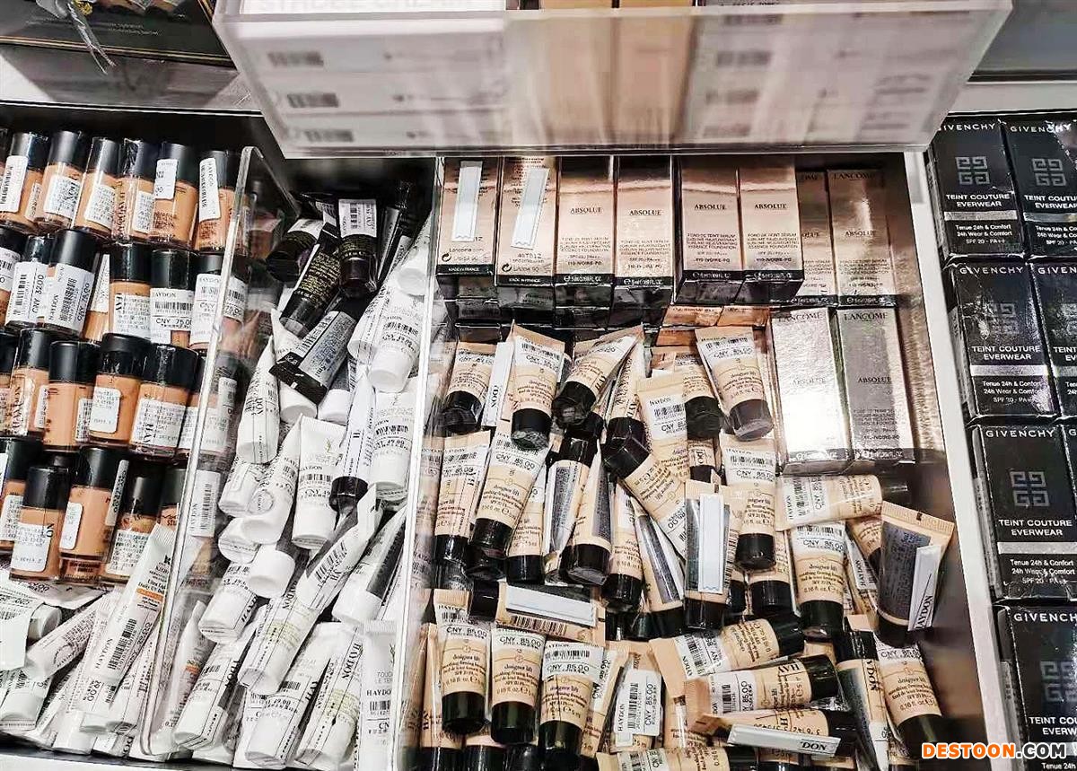 记者看到,这家店整体设计呈现出满满的工业风,各种小样商品布置于各个货架、档口,数量多、品种多,并且陈列起来怎么杂乱怎么来,犹如进入一个化妆品仓库。