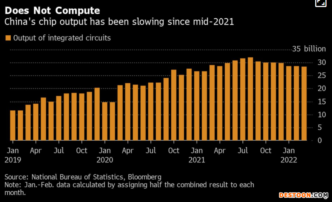 据彭博社报道,中国半导体季度产量自 2019 年初以来首次出现萎缩,主要原因是消费电子产品需求疲软以及包括上海在内的地区因新冠疫情引发的封锁中断了产量。