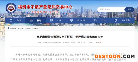 据了解,为进一步优化营商环境、提升便民惠企服务水平,2021年10月8日起,福州市本级商品房预售许可项目实行颁发《商品房预售许可证》电子证照。《商品房预售许可证》电子证照与原先的纸质版《商品房预售许可证》具有同等法律效力。房地产开发企业和群众可通过e福州及中心官网、微信公众号平台查看及下载《商品房预售许可证》电子证照,并可扫描证上“二维码”核验证照信息。