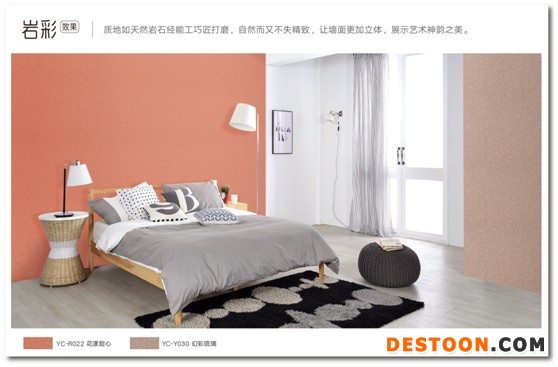 岩彩效果艺术漆:质地如天然岩石经能工巧匠打磨,自然而又不失精致,让墙面更加立体。多种色彩选择。