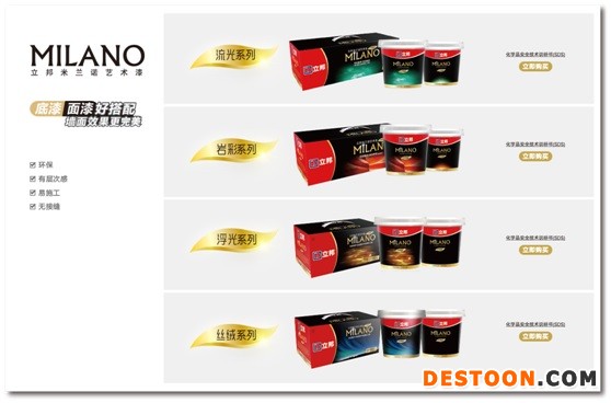 立邦米兰诺艺术漆全系列为使用水性原料,安全环保,能够同时满足消费者对墙面装饰及安全环保的需求;专业底漆的配套,也使得饰面靓丽多彩的同时,保持优异持久的涂装效果。