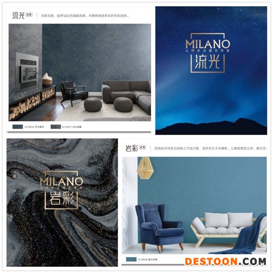 本次立邦米兰诺艺术漆新品上市,带来的是流光、岩彩两大系列,丰富的色彩效果与细腻的质感,打造独一无二的艺术气息。