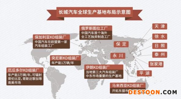 作为第一批走出国门的中国汽车企业,长城汽车在国家经济的快速发展下,不断坚持品牌向上,成功叩开了全球市场大门,与来自全球主要市场的30家全球合作伙伴构建起的海外销售网络已达400余家,全球销售市场布局业已形成。