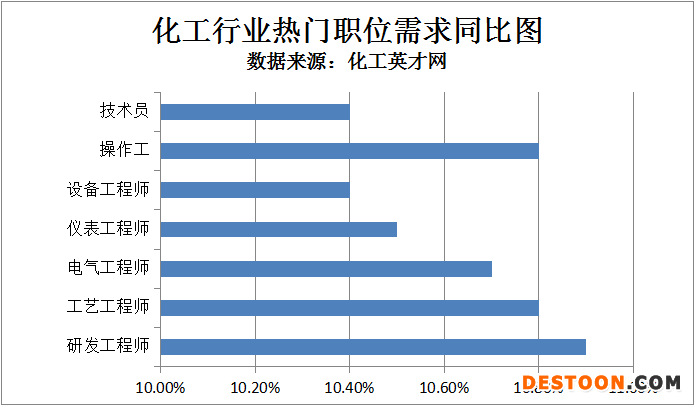 从具体的招聘职位分类来看,根据化工英才网首页“泛长三角地区专场网招会”专题的企业数据显示,截至4月中旬,研发工程师、工艺工程师、电气工程师、仪表工程师、设备工程师的招聘需求与去年同期相比正平稳上升。其他职位中,操作工、技术员的职位需求同比增长较为明显。