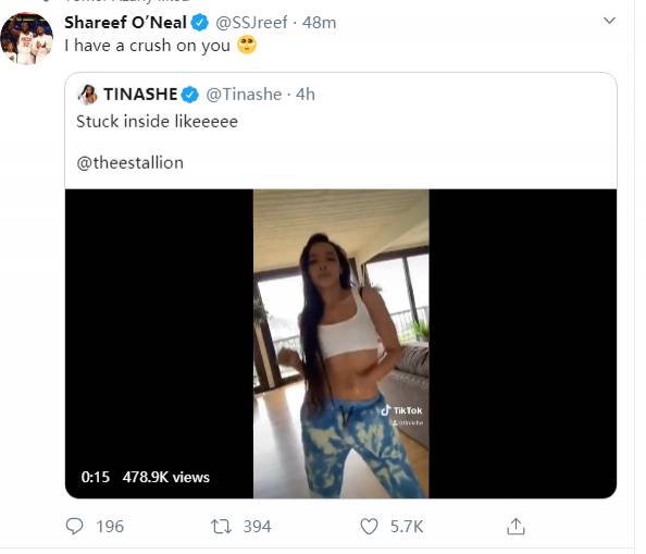 3月18日讯 今天NBA名宿大鲨鱼的大儿子沙里夫-奥尼尔在推特上转发了一位网红美眉辣舞的视频,并表白这位妹子:“我对你有一点心动。”