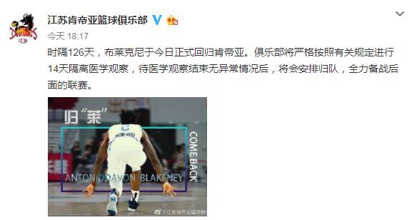 3月19日讯 今日江苏肯帝亚篮球俱乐部宣布:时隔126天,布莱克尼于今日正式回归肯帝亚。俱乐部将严格按照有关规定进行14天隔离医学观察,待医学观察结束无异常情况后,将会安排归队,全力备战后面的联赛。