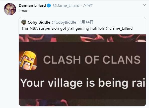 3月15日讯 今日,开拓者球星利拉德在推特上被人点名,原因是在游戏《部落冲突》(Clash Of Clans)里把网友的部落掠夺了。