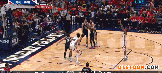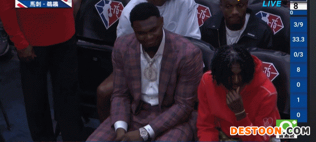 4月14日讯 今日NBA附加赛,鹈鹕主场迎战马刺,转播方在比赛间歇将镜头给到此役无法出战的锡安。