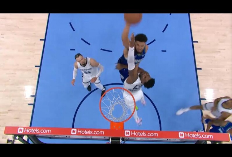 比赛第三节,唐斯高位接传球的同时直接卡过莫兰特,冲入内线面对小贾伦补防丝毫不惧,举火烧天起飞炸裂隔扣小贾伦,视觉张力拉满,后者被隔扣之后还怒推麦克丹尼尔斯,吃到技术犯规。