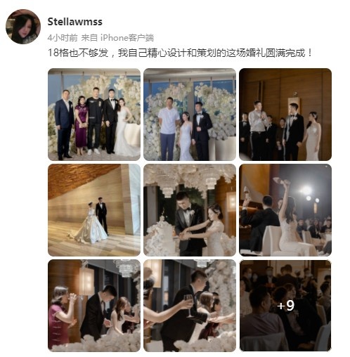 王薪凯妻子发博晒出一组婚礼现场照,并写道:“18格也不够发,我自己精心设计和策划的这场婚礼圆满完成!”