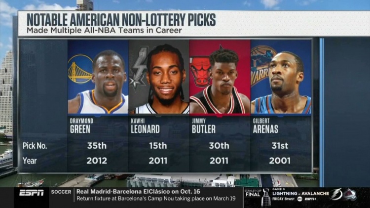 6月24日讯 2022年选秀大会将在今日上午8点进行,美媒Talkin_NBA在大会开始前晒出了非乐透多次入选年度最佳阵容的美国球员。
