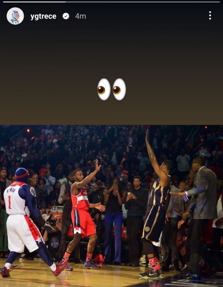 随后乔治更新了INS,他晒出一张当年自己与沃尔在2014年全明星扣篮大赛上的同框照(两人均是参赛选手),照片中两人大肆庆祝着,乔治配文:“