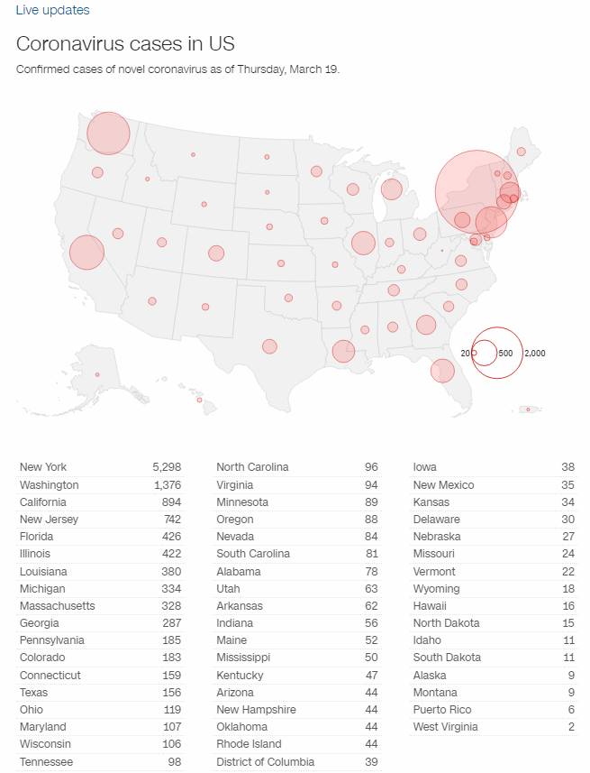 根据CNN统计,截止美国东部时间3月19日晚7点,全美报告新冠肺炎确诊病例13133例,较昨日新增5233例,死亡193例,较昨日新增53例,治愈121例。