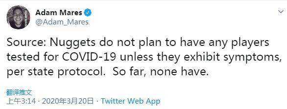 据随队记者Adam Mares报道,根据州协议,除非出现症状,掘金不打算对任何球员进行新冠病毒检测。目前为止,球员还未出现症状。