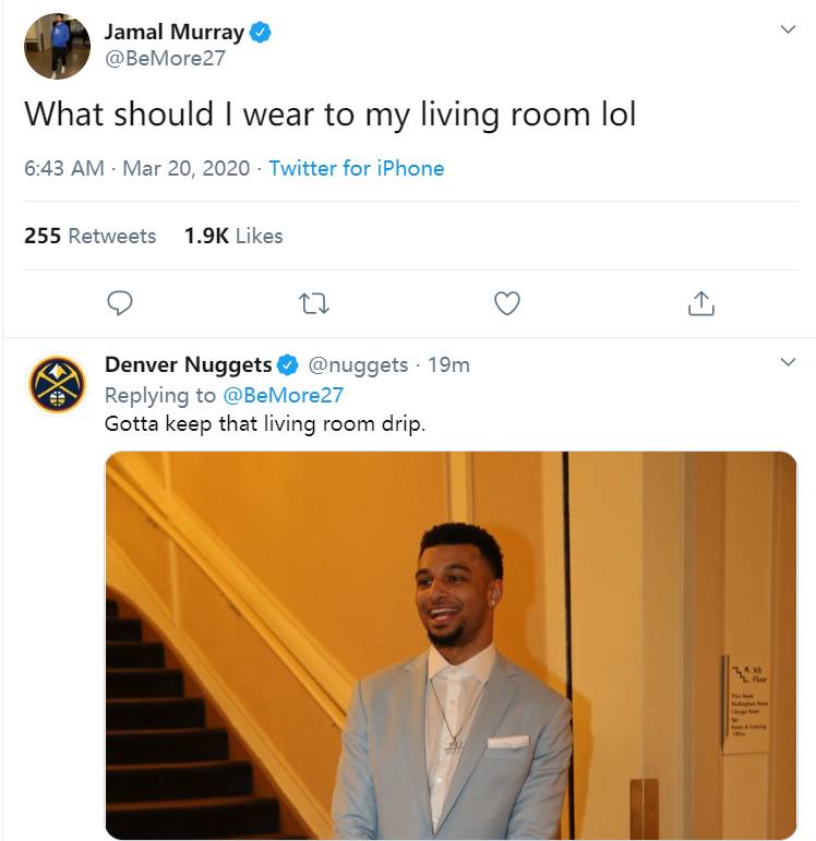 3月20日讯 掘金队球员贾马尔-穆雷今日更新个人社交媒体,发问:“去客厅该穿啥?”得到了掘金官推的回复。
