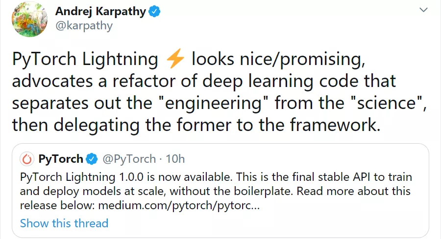 特斯拉 AI 负责人 Andrej Karpathy 也评论称:「这看起来很棒,也很有前途。PyTorch Lightning 倡导对深度学习代码进行重构,将『工程(硬件)』与『科学(代码)』分割开,然后将前者委托给框架。」