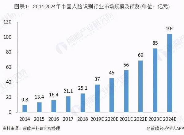 根据报告分析,目前中国人脸识别市场规模约占全球市场的15%左右。2010-2018年,中国人脸识别市场规模逐年增长,年均复合增长率达30.7%。2018年,我国人脸识别行业市场规模为25.1亿元。预计,未来五年人脸识别市场规模将保持23%的平均复合增长速度,到2024年市场规模将突破100亿元。