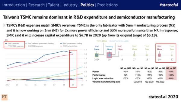但台积电在研发支出和半导体制造方面仍占据业内主导地位。台积电的研发费用与中芯国际的收入相当,前者是目前唯一商用 5nm 制造工艺 (N5) 的制造商,目前正致力于 3 纳米制造工艺 ,其功率效率比 7 纳米高出 2 倍,性能比 7 纳米高出 33% 。不久之前,中芯国际也表示,2020 年会将资本支出增至 67 亿美元(高于原定目标 31 亿美元)。