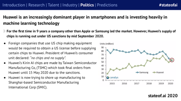使用美国芯片制造设备的外国公司必需获得美国政府的许可,才能向华为提供某些芯片。华为消费者业务 CEO 余承东在中国信息化百人会 2020 年峰会上表示:「我们手机业务现在很困难,芯片供应困难,很缺货。」