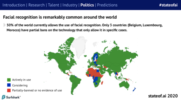 目前,世界上 50% 的地方都允许使用人脸识别技术,只有 3 个国家 (比利时、卢森堡、摩洛哥) 部分禁止该技术,只允许在特定情况下使用。