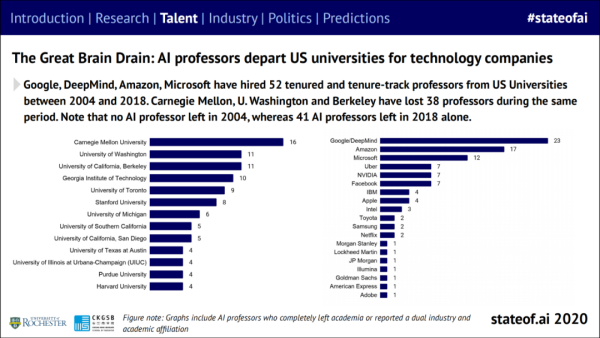 首先,学术界面临人才外流的情况,美国许多研究教授离开大学,前往科技公司任职。从 2004 年至 2018 年,谷歌、DeepMind、亚马逊、微软已经从美国大学聘请了 52 位终身教授。卡内基梅隆大学、华盛顿大学和伯克利大学在同一时期失去了 38 名教授。值得注意的是,仅 2018 年一年就有 41 位 AI 教授离开。