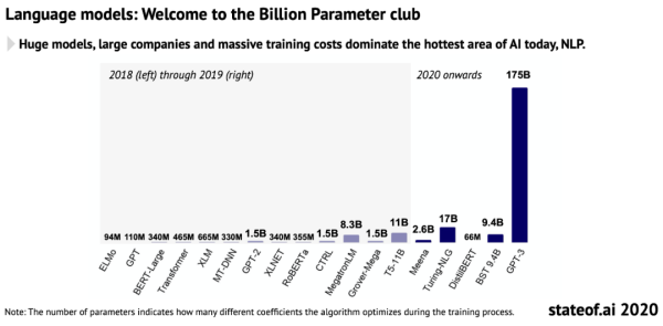另一方面,大尺寸模型正在推动着 NLP 领域的技术进步,OpenAI 的 GPT-3 等新研究已经把深度学习模型的参数数量推到了千亿。根据目前的云服务算力价格,训练每 1000 参数的模型平均需要 1 美元,拥有 1750 亿参数的 GPT-3 可能需要花费百万美元级别的费用,有专家认为这一数字超过了 1000 万美元。高昂的训练费用,让研究人员们在探索新方向时遭遇了挑战。