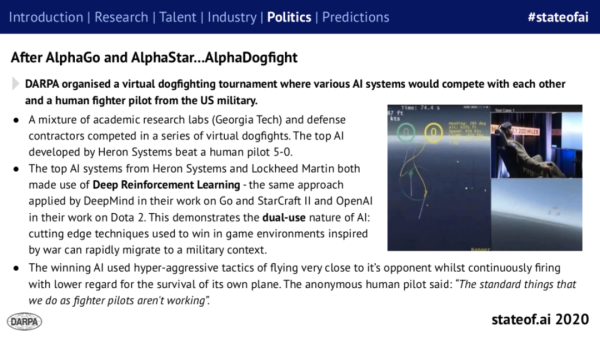 从 AlphaGo、AlphaStar 到 AlphaDogfight,借助深度强化学习技术,人工智能正在更多的领域击败顶尖人类选手。这也充分说明,在游戏对战环境中所训练的取胜技术,可以迅速迁移到军事环境中。被击败的飞行员表示:「作为战斗机飞行员,我们往常的标准操作方法已经不起作用了。」