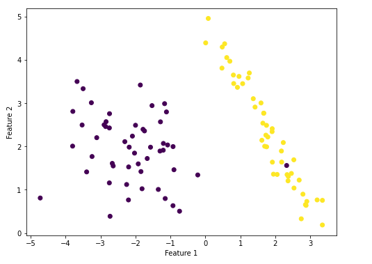 鍏剁粨鏋滃鍥?5鎵?绀恒?傝繖涓暟鎹泦鏄垜浠敤make_classification鏂规硶鐢熸垚鐨勶紝鍏?100涓偣锛屼竴鍏变袱涓壒寰?(缁村害)锛屾墍鏈夋暟鎹叡鍒嗕负涓や釜绫汇?備粠鍥句腑鍙互鐪嬪嚭绱壊鐨勭偣鍒嗕负涓?绫伙紝榛勮壊鐨勭偣鍒嗕负鍙︿竴绫汇?傜劧鍚庡鏁版嵁闆嗚繘琛屼竴涓嬪垝鍒嗭紝鍒嗕负璁粌闆嗗拰娴嬭瘯闆嗭紝浠g爜濡備笅銆俋_train, X_test,y_train, y_test = train_test_split(X, y, test_size=0.30, random_state=30)