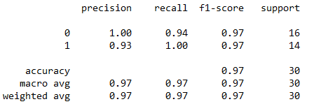 缁撴灉濡傚浘6鎵?绀恒?備粠鍥?6涓垜浠彲浠ョ湅鍑鸿妯″瀷鐨刟ccuracy涓?0.97锛屽洜涓烘垜浠殑娴嬭瘯鏁版嵁鍏辨湁30涓紝鎵?浠ヨ繖鎰忓懗鐫?鎴戜滑鍙湁1涓偣棰勬祴閿欎簡锛岃鏄庤妯″瀷鐨勫垎绫绘晥鏋滆繕鏄潪甯镐笉閿欑殑銆?