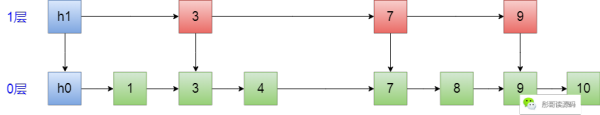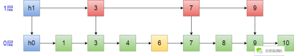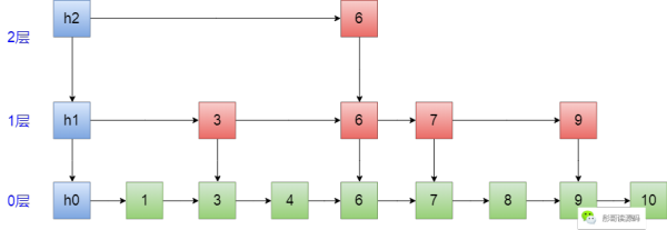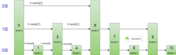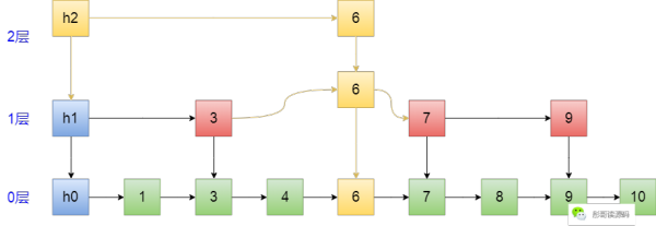 普通节点,处于0层的节点,存储数据,典型的单链表结构,包括h0 索引节点,包含着对普通节点的引用,同时增加向右、向下的指针 头索引节点,继承自索引节点,同时,增加所在的层级