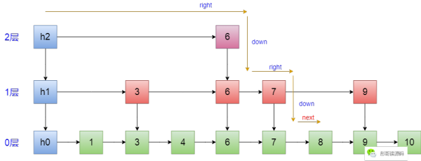 查找元素,是通过头节点,先尽最大努力往右,再往下,再往右,每一层都要尽最大努力往右,直到右边的索引比目标值大为止,到达0层的时候再按照链表的方式来遍历,用图来表示如下: