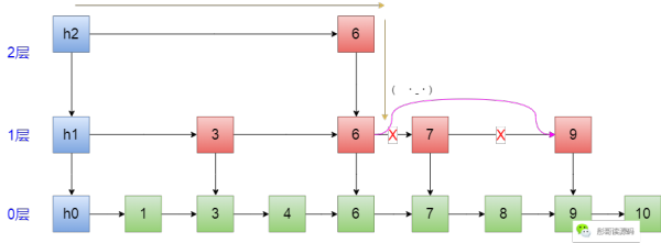 让我们模拟一下查找的过程,比如,要查询8这个元素,只需要从头节点的最高层,往右到6这个节点,6在2层向右为空了,所以转到1层,向右到7这个节点,7再向右看一下,是9,比8大,所以7向下到0层,再向右,找到8,所以,整个走过的路径为:h(2)->6(2)->6(1)->7(1)->7(0)->8(0)。