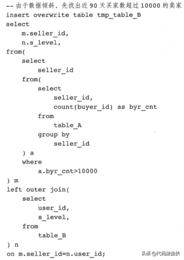 首先需要知道大卖家的名单,即先建立一个临时表动态存放每日最新的大卖家(比如dim_big_seller),同时此表的大卖家要膨胀预先设定的倍数(比如1000倍)。