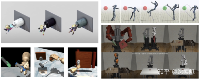 Simulation environment (模拟环境): 模拟环境是一个整体框架,包含多个元件:物理引擎、渲染引擎、模型(包括场景、物体、机器人)等。我们可以用模拟环境模拟一个给定的任务,并用它来研究其解决方案。
