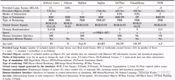 除此之外,例如 Sapien, AI2Thor, ThreeDWorld (TDW)的一些模拟环境开始逐渐支持场景级的交互任务。Sapien 侧重的问题是与铰接(articulated)物体的互动(如门、柜等)。TDW 提供高质量的声音、形变、液体模拟(基于英伟达的 Flex 物理引擎)。但 Sapien 和 TDW 均不提供大型场景模型,从而不支持有关大型场景的任务研究。AI2Thor 虽包含了可互动的场景,但互动为脚本化的符号交互,把现实中连续的互动和变化离散化了—当物体满足一个先觉条件,agent 可以发出一个指令,从而这个物体进入其下个状态。例如,一个冰箱的敞开程度本应是连续值,但现在只有 “开” 和“关”两个状态。AI2Thor 之后出现了 RoboThor,但其只提供简单的传感器与一种机器人 LoCoBot 的模拟。受限于 LoCoBot 的技术限制与环境的离散化,机器人无法在模拟环境内学习并解决复杂的交互任务。