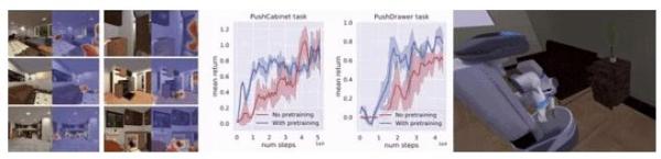 iGibson 场景的充分可交互性可以帮助预训练机器人视觉,从而加速机器人学习并完成复杂的交互任务。