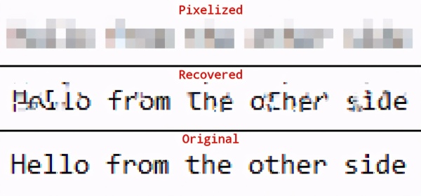 Depix 能够从像素化图像截图中恢复原图中包含的文字密码。该项目适用于使用线性方框滤波器(linear box filter)创建的像素化图像。如下图所示,项目作者给出了像素化图像、恢复之后的效果和原图的对比结果: