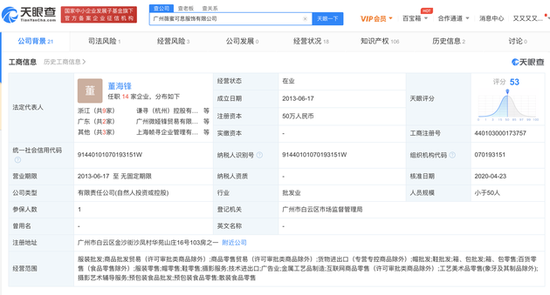 广州薇蜜可思服饰有限公司成立于 2013年6月17日,注册资本为50万人民币,法定代表人为薇娅丈夫董海锋,公司经营范围包括服装批发;商品批发贸易;商品零售贸易;货物进出口等。该公司由董海锋持股55%,温州天昊电气有限公司。由黄薇(薇娅)持股45%。