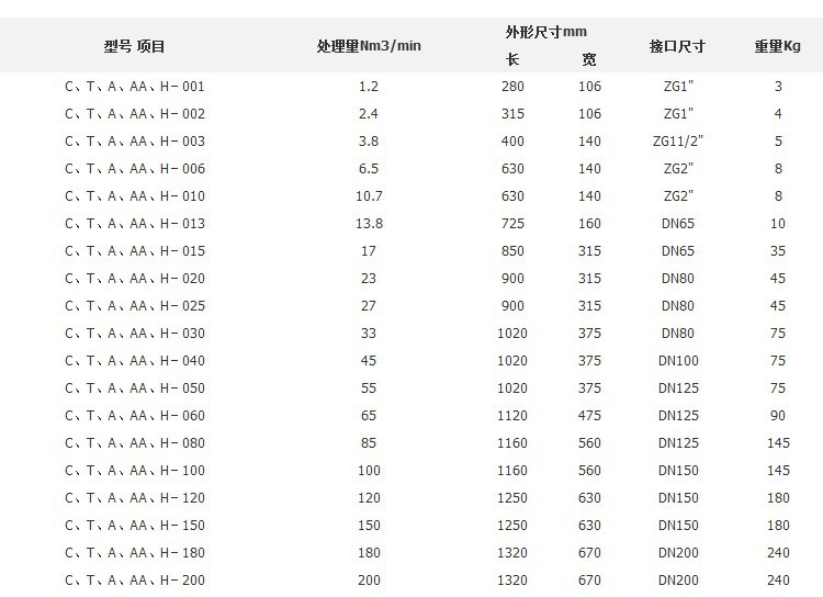 Model,size & technical data | 型号 | 空气处理量(m3/min) | 滤芯号码 | 滤芯盖外径mm | 滤芯盖度mm | 过滤器最大重量kg | 过滤器外形尺寸(mm)高Hx宽W |