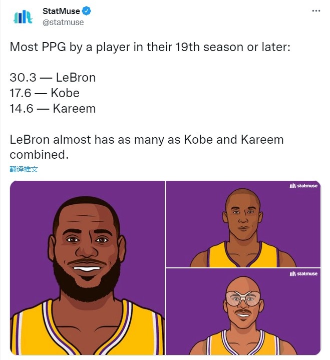 美媒刚刚发布了一组数据,本赛季是詹姆斯的第19个赛季,詹姆斯场均可以得到30.3分8.2篮板6.2助攻。生涯第19赛季及以上,詹姆斯30.3的场均得分几乎和科比(17.6分)和贾巴尔(14.6分)相加一样。