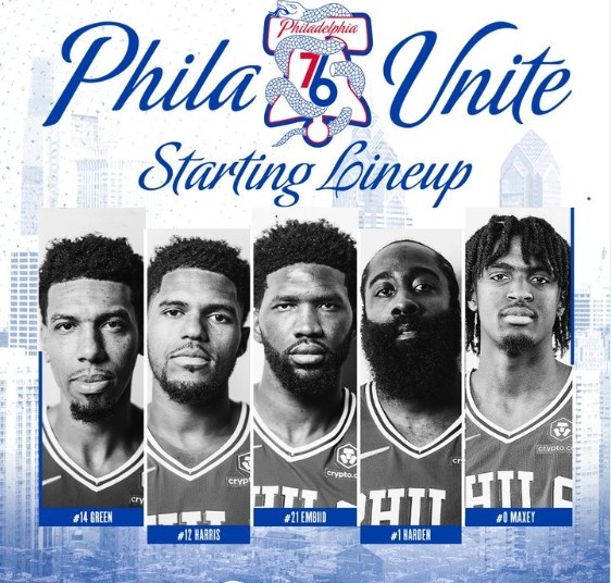 76人:哈登、恩比德、马克西、丹尼-格林、哈里斯。