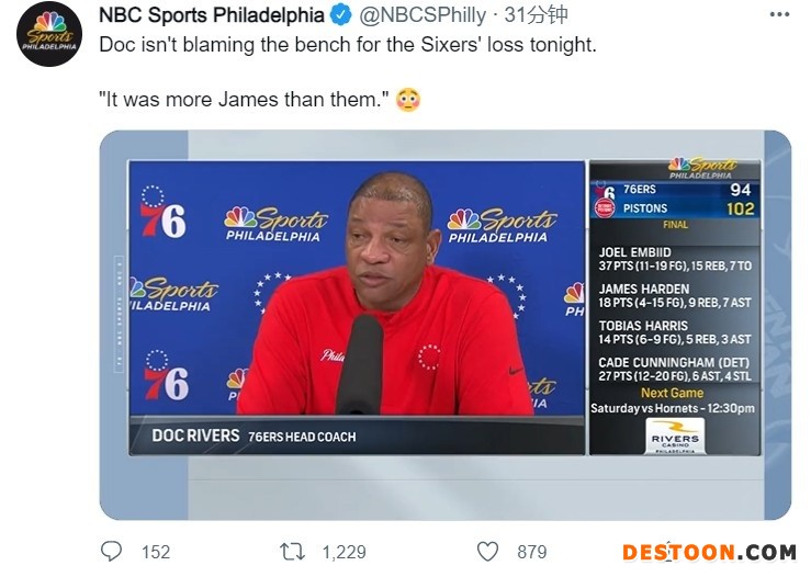 康宁汉姆27+6 恩比德37+15 哈登18+9+7 76人不敌活塞遭3连败