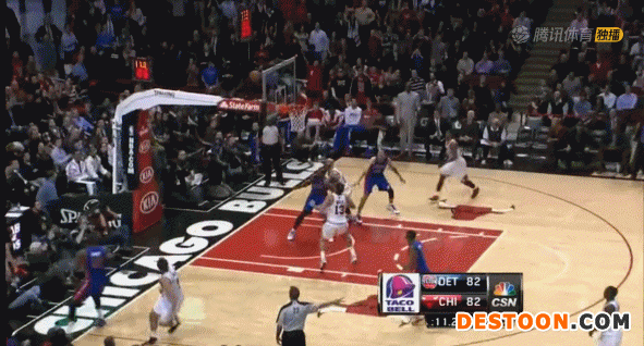 比赛常规时间的最后一个回合,公牛掌控球权,外线投手贝里内利在活塞球员的干扰下三分不中,面对即将飞出端线的球,公牛中锋诺阿斜刺里杀出,将球救回场内,机敏的贝里内利将功补过,顺势接到皮球完成了突袭上篮2+1,可以说,诺阿的这次端线极限救球,为公牛艰难的锁定了本场比赛的胜局。