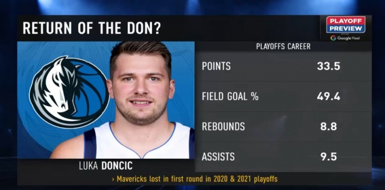 数据显示,东契奇生涯目前共出战13场季后赛(分别以2-4和3-4不敌快船),场均得到33.5分8.8篮板9.6助攻1.3抢断,投篮命中率49.4%,三分命中率39.2%。