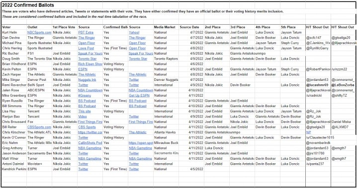 4月12日讯 目前所有有投票权的媒体人都已递交自己的MVP选票。据reddit网友的统计,目前有26位记者公布了自己的选票。 其中约基奇得到18张第一选票,恩比德得到5张,字母哥3张。