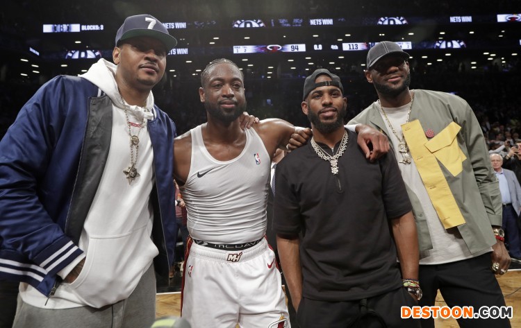 值得一提的是,香蕉船兄弟詹姆斯、保罗、安东尼都来到了篮网队的主场,见证韦德的“最后一舞”。