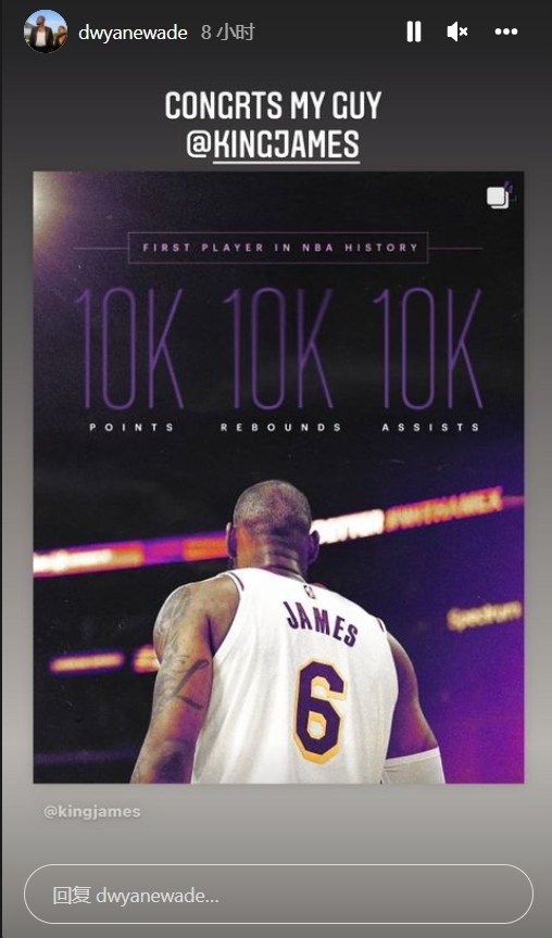 詹姆斯的好兄弟韦德更新Ins,祝贺詹姆斯达此成就,韦德写道:“祝贺我的兄弟@詹姆斯。”