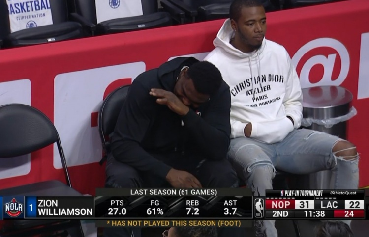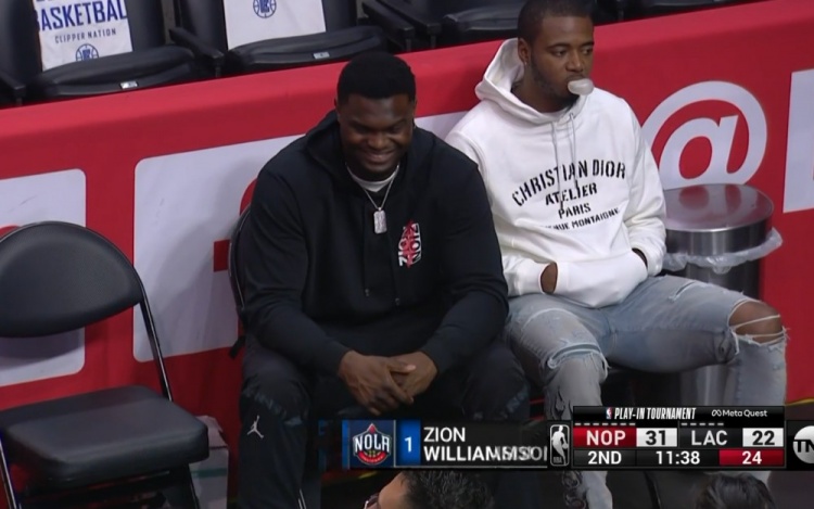 转播镜头给到了鹈鹕球星锡安,锡安在场边捂嘴偷笑。