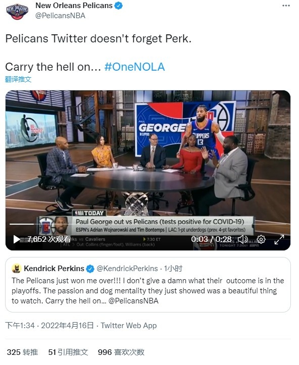 值得一提的是,鹈鹕官推转发了这个推特,并附上了赛前预测时,帕金斯选择支持快船的视频,并写道:鹈鹕球迷记性可不差啊Perk(帕金斯)。
