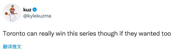 奇才球员库兹马发推点评了这轮系列赛:“猛龙真的能够赢下这轮系列赛,前提是他们也想赢。”